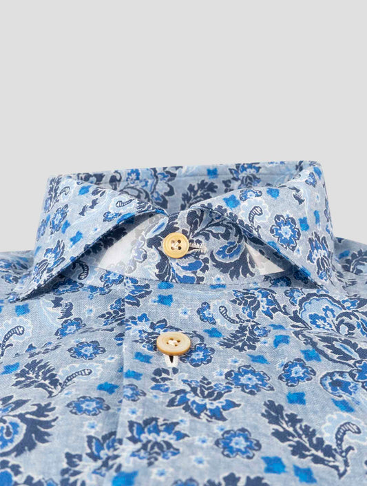 Kiton Blue Linen Shirt - Floral Pattern Italian Handmade