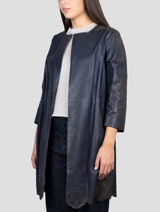 Kiton Blue Genuine Leather Women's Overcoat - Italian Handmade