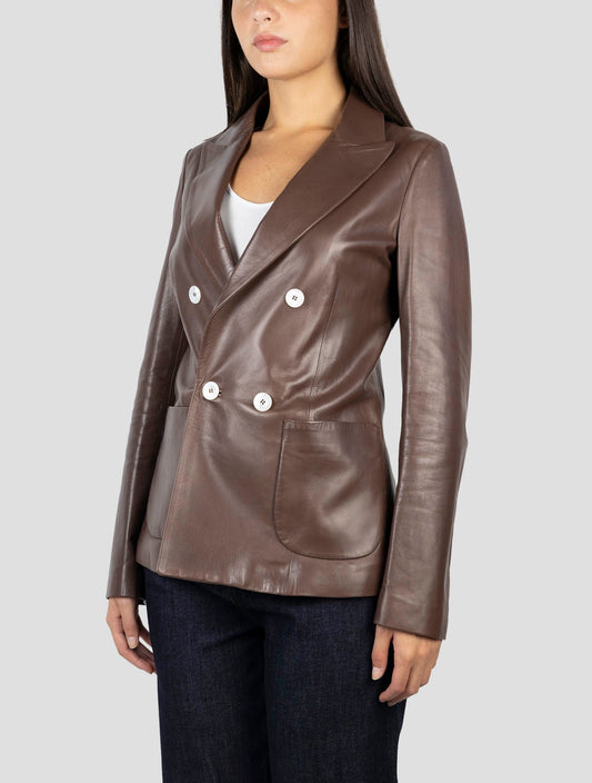 Kiton Women's Double-Breasted Brown Leather Blazer - Premium Italian